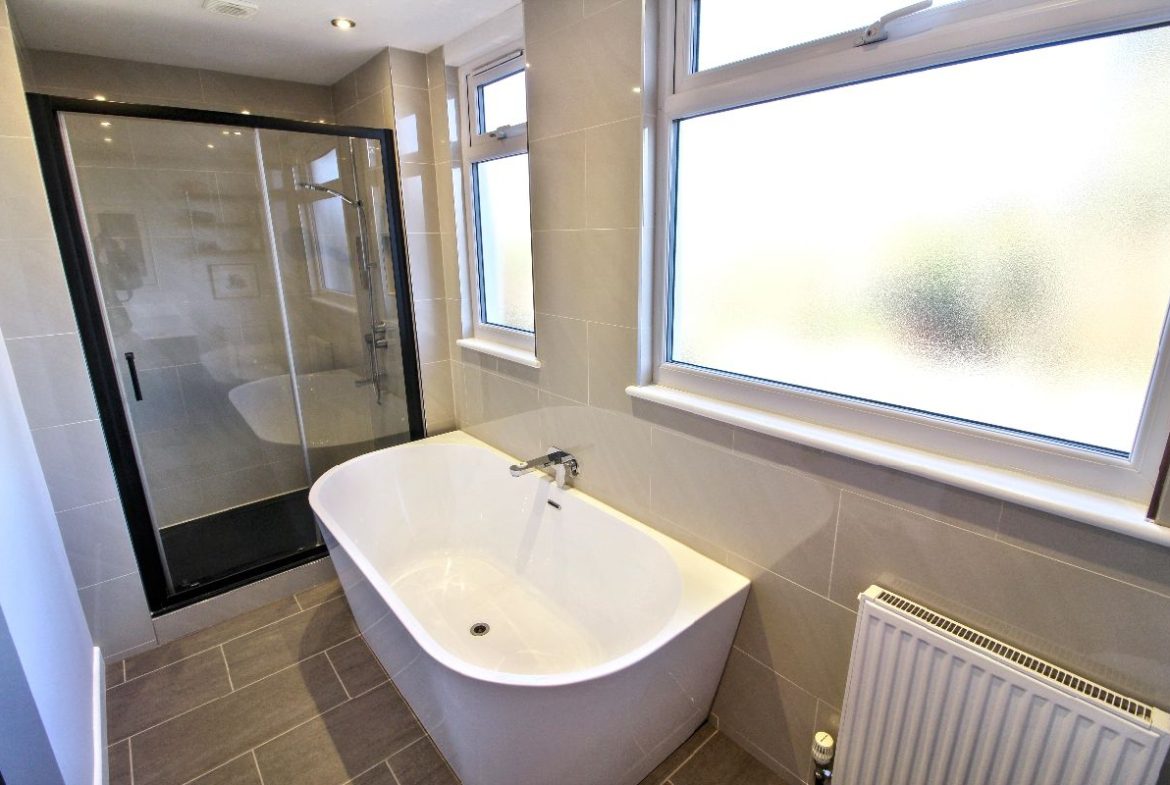 Double ended slipper style bath with mixer tap, shower cubicle and thermostatic shower, sink and vanity unit with mixer tap, low flush wc, towel radiator, double radiator, spotlights to ceiling, rear facing double glazed window, ceramic tiled floor, extractor fan, tiling to splash areas.