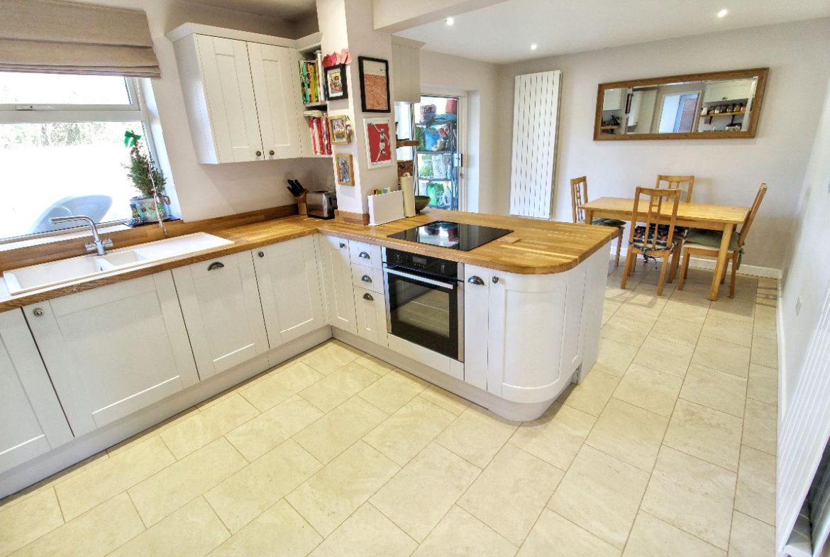 Range of wall and base units, one and a half sink and drainer with mixer tap, work-surfaces, integral fridge, freezer and dishwasher, electric hob and oven built into breakfast bar, doors to hallway, utility and conservatory, spotlights to ceiling, two wall radiators, and ceramic tile flooring.