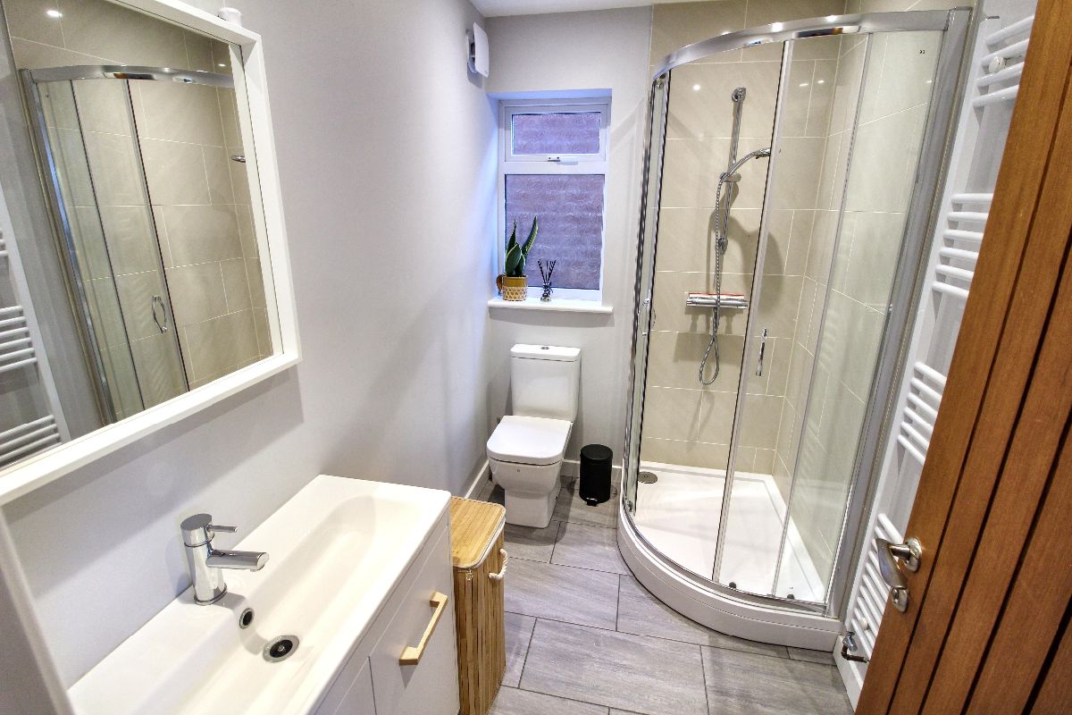 Corner shower cubicle with thermostatic shower, sink and vanity unit with mixer tap, low flush WC, heated towel radiator, double glazed side facing window, ceramic tile flooring, spotlights to ceiling, extractor fan, tiles to splash area.