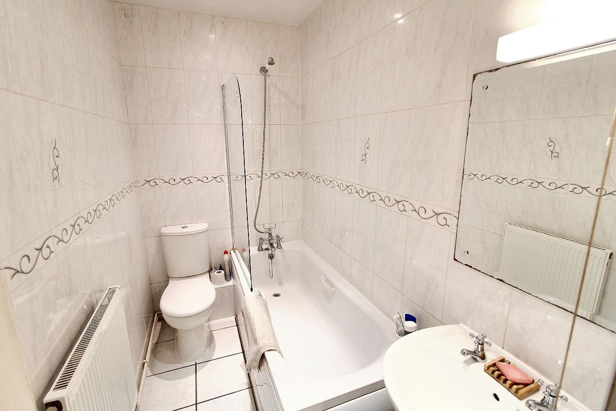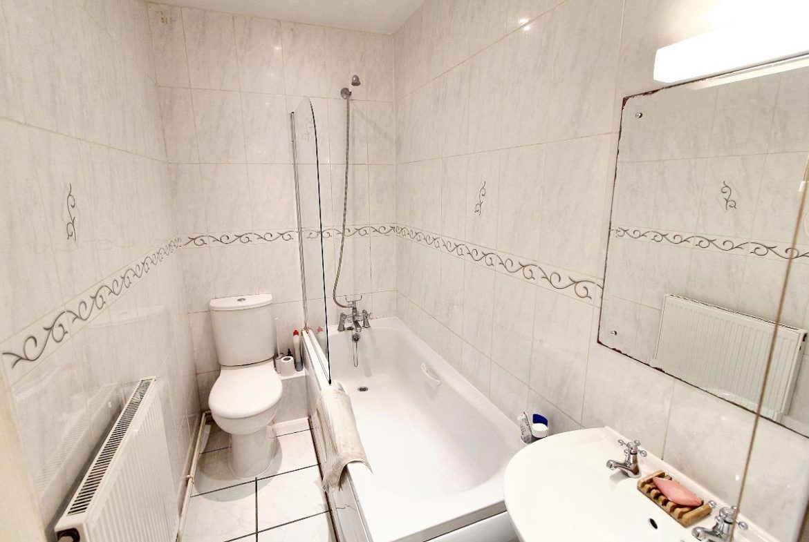 Panel enclosed bath and mixer shower set, sink and pedestal, low flush wc, double radiator, floor to ceiling tiled, extractor fan, spotlights to ceiling.