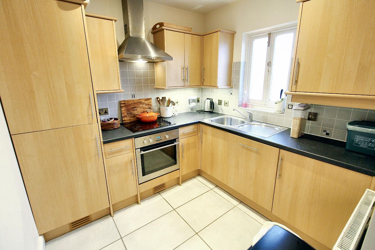 Range of wall and base units, sink and drainer with mixer tap, worksurface, electric hob, oven and extractor hood, integral fridge, freezer, dishwasher and washer/dryer, spotlights to ceiling, ceramic tiled floor.