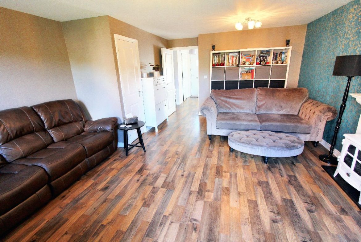 Doors leading to kitchen, lounge/diner and downstairs wc, stairs to the first floor, radiator, laminate effect floor.