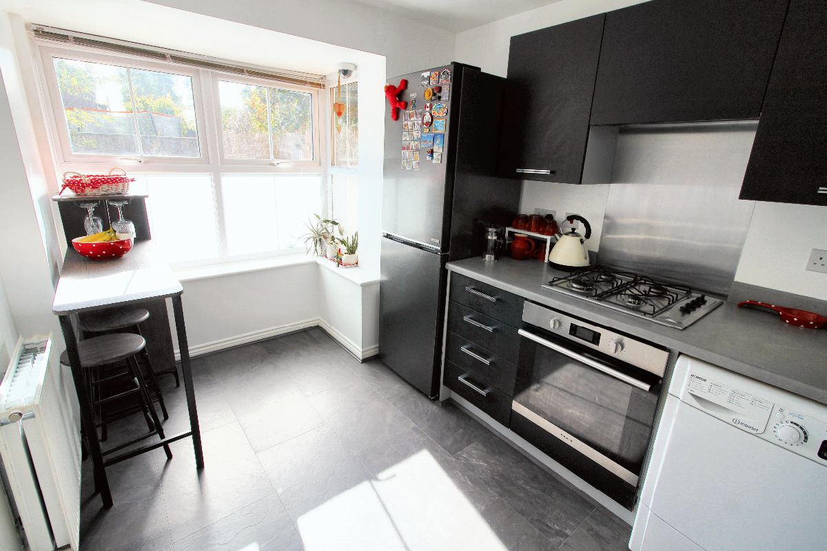Range of wall and base units, worksurface, gas hob with integral oven and extractor fan over, one and half sink and drainer with mixer tap, plumbing for a washing machine and a dishwasher, space for fridge/freezer, double glazed front facing window, radiator.