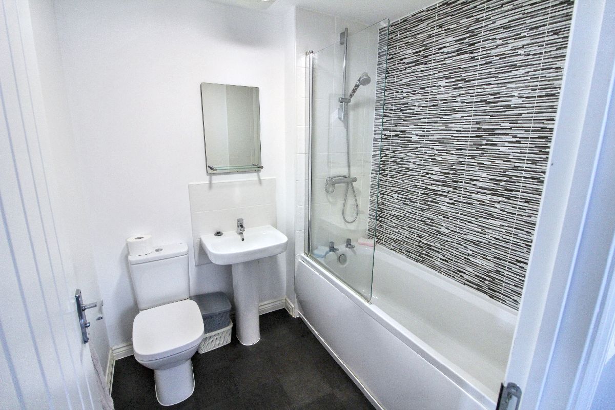 Panel enclosed bath with thermostatic shower over, low flush wc, sink and pedestal with mixer tap, tiling to splash areas, radiator, extractor fan, vinyl flooring.