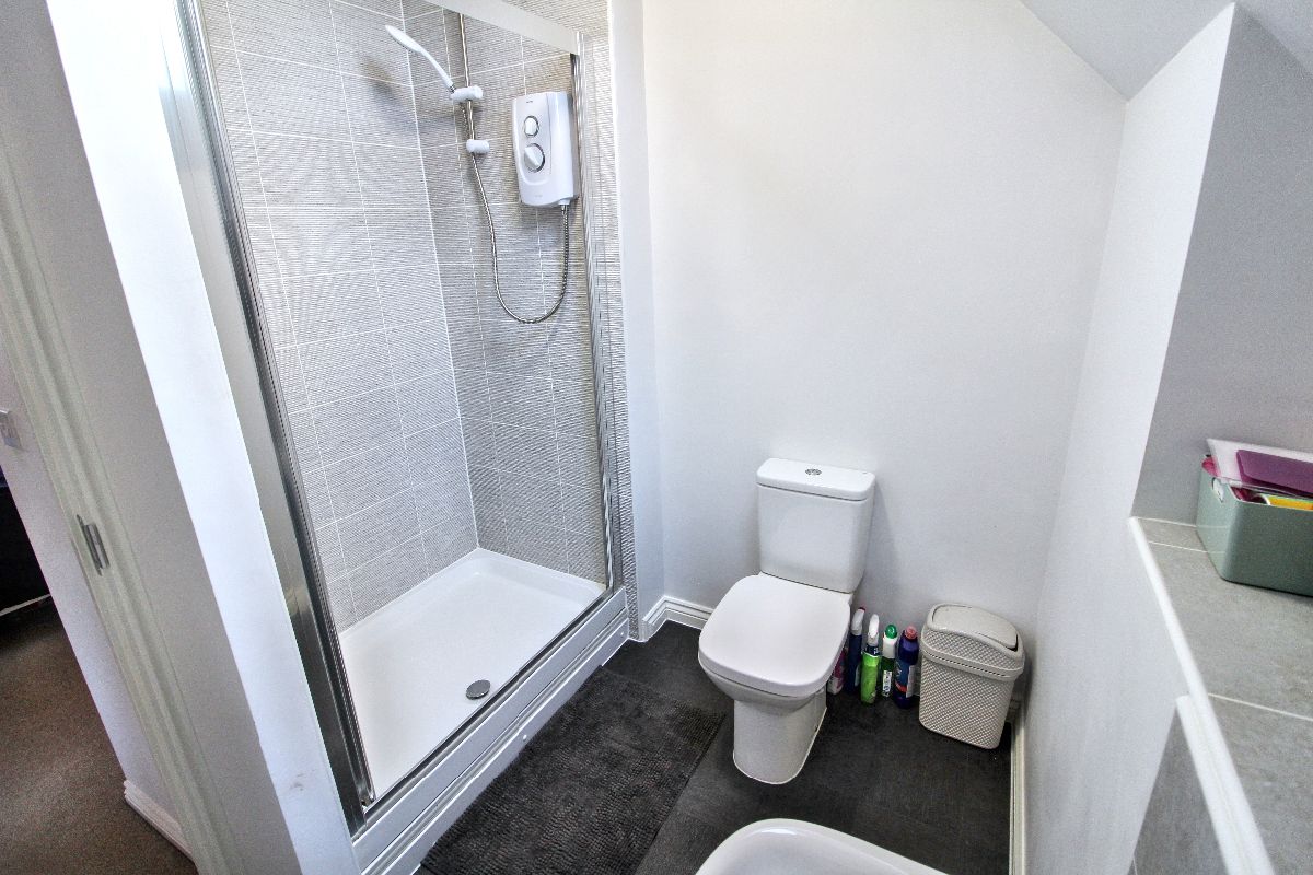 Walk in shower cubicle with electric shower, low flush wc, sink and pedestal with mixer tap, double glazed rear facing Velux window, extractor fan, radiator, vinyl flooring.