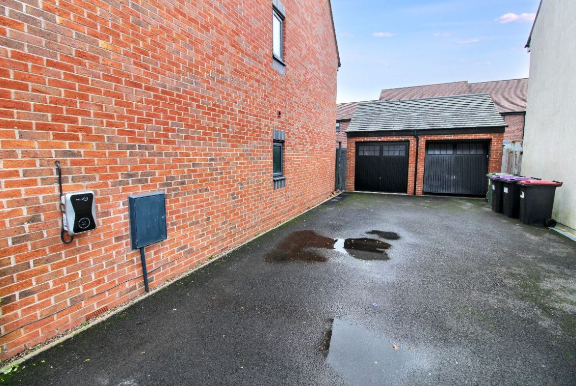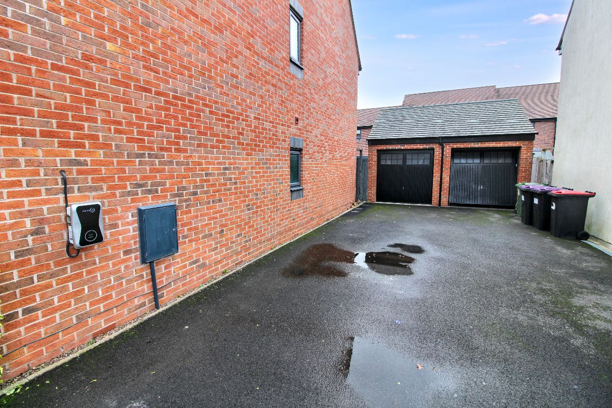 Tarmacked driveway providing ample off road parking and garage access, wall mounted EV charging point, side gate to rear, pathway to fore garden and front entrance door.