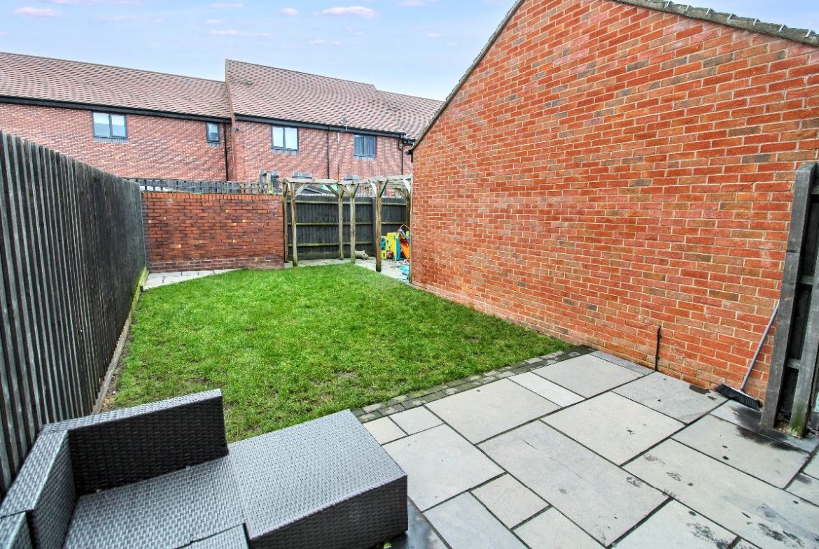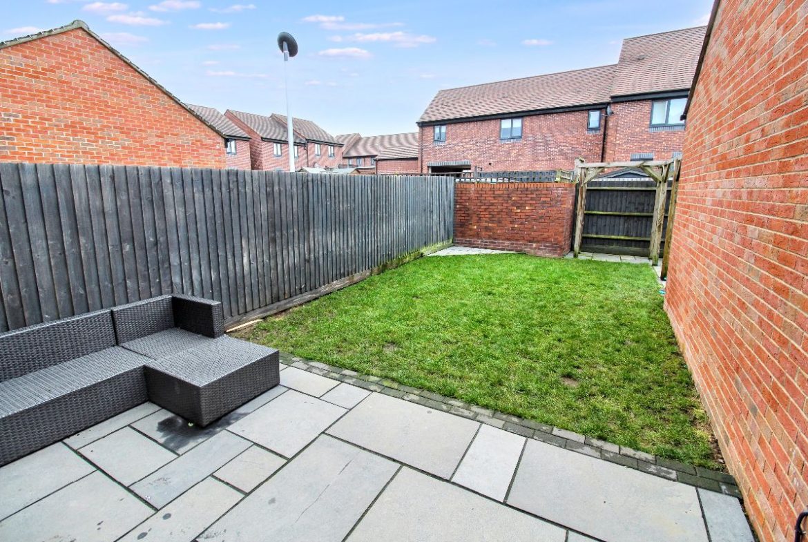 Paved patio area, garden lawned to rear with further patio area, side gate to driveway.