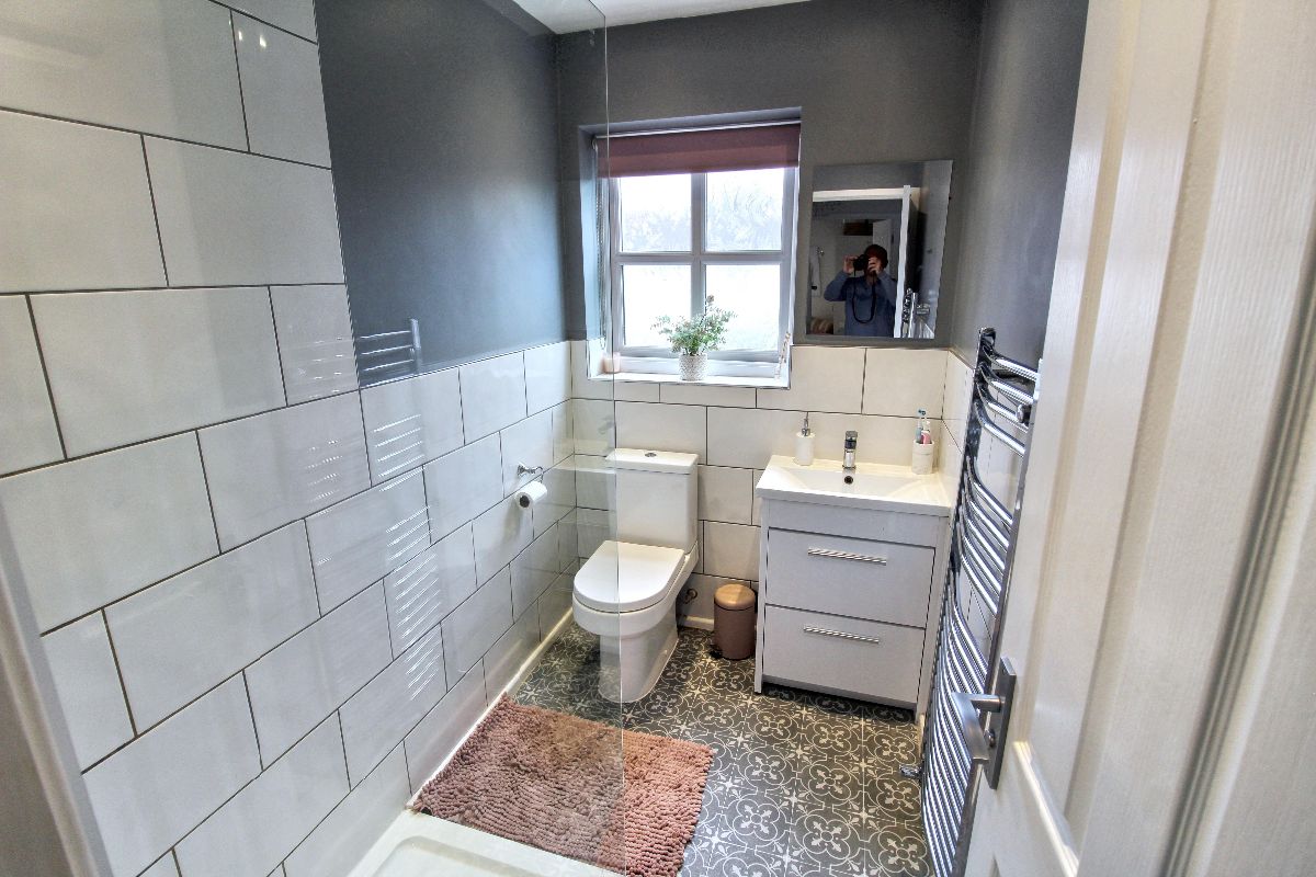 Walk in shower with electric shower over, sink and vanity unit with mixer tap, low flush wc, double glazed rear facing window, towel radiator, extractor fan, spotlights to ceiling, vinyl flooring.