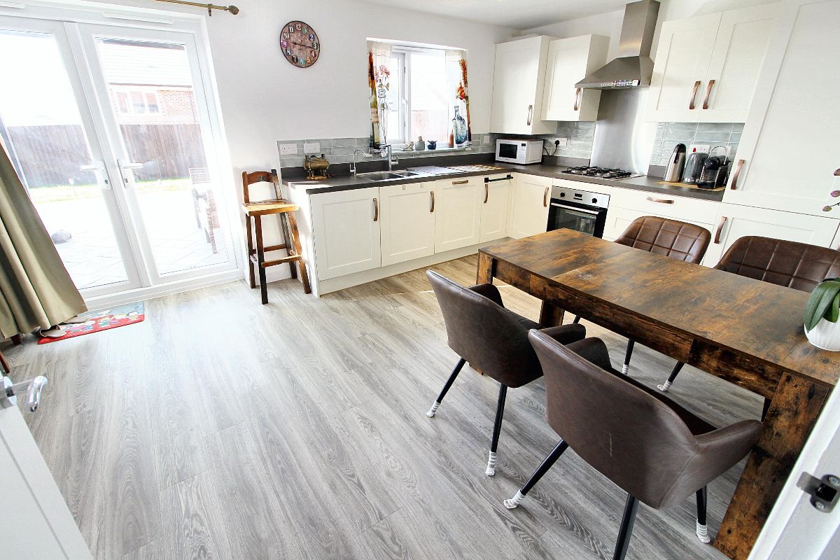Range of wall and base units, one and half sink and drainer with a mixer tap, separate filtered water tap, worksurface, integral dishwasher, washing machine, fridge and freezer, gas hob, oven and extractor hood, double glazed rear facing window, double glazed rear facing French doors to patio and garden, door to storage cupboard, luxury vinyl flooring, double radiator.