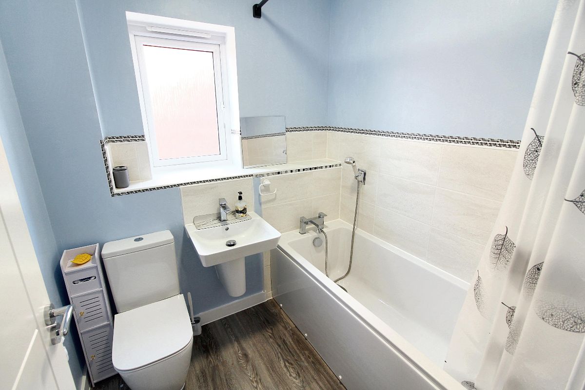 Panel enclosed bath with mixer shower set, low flush wc, sink and mixer tap, double glazed side facing window, tiling to splash areas, double radiator, extractor fan.