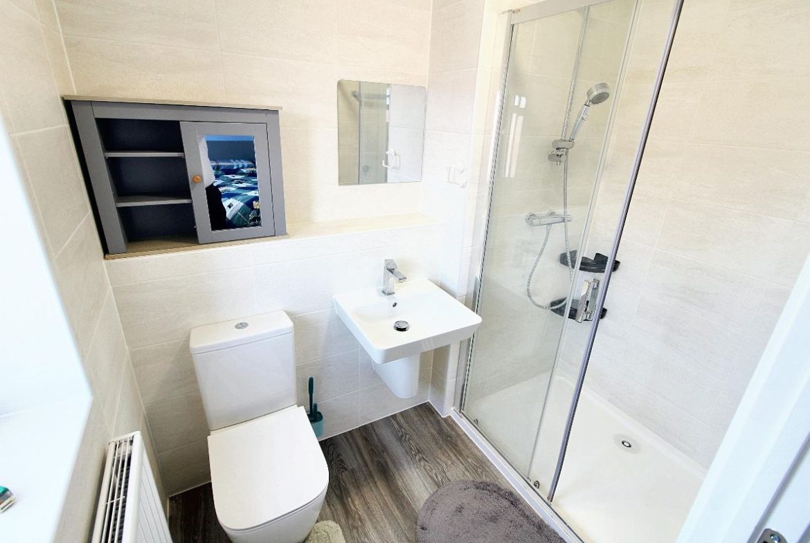 Walk in shower cubicle with thermostatic shower, low flush wc, sink and mixer tap, double glazed front facing window, tiling to splash areas, double radiator.