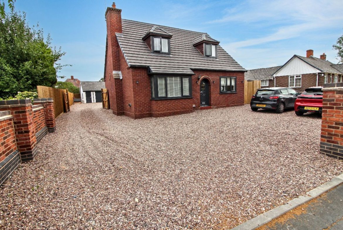 This attractive home sits behind a smart brick boundary wall and offers a striking first impression. A large gravel driveway provides generous parking for multiple vehicles, with direct access to the side driveway leading to the detached garage at the rear. The property’s modern windows and distinctive arched doorway add to its kerb appeal.