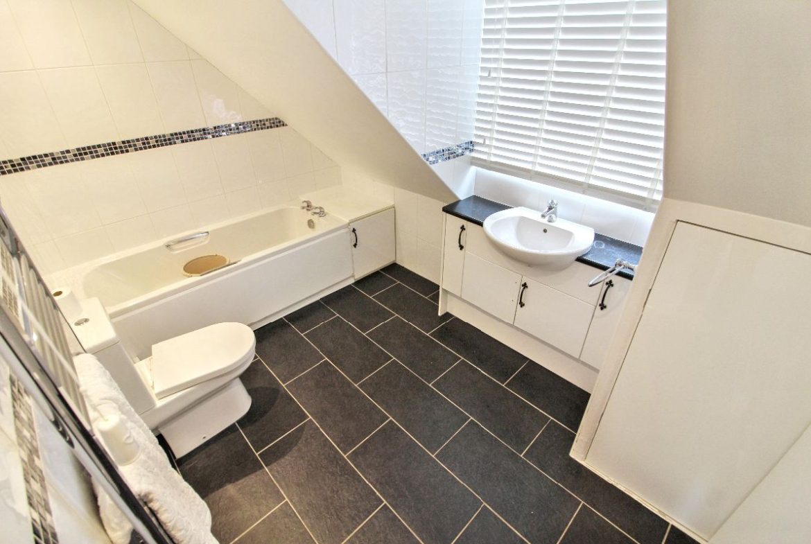 Shower cubicle with thermostatic shower set, panel enclosed double ended bath with mixer tap, sink and vanity with mixer tap, low flush WC, heated towel rack, tiles to splash area, roof spotlighting.